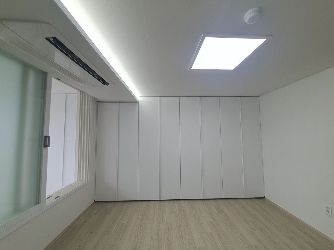 높이 제약이 있는 구조에 대응해 간접조명박스를 계획하고, 에어컨 본체 및 배관을 비가시화(非可視化)함으로써 돌출 요소를 효과적으로 감춤. 천장의 숨은 디테일까지 고려한 마감 설계는 공간의 정밀도와 시각적 완성도를 동시에 충족할 수 있음.